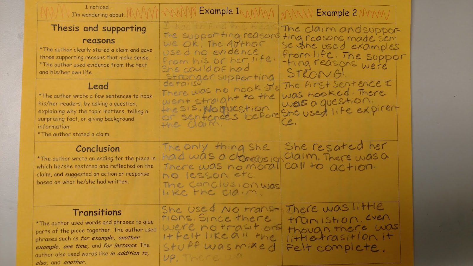 When we finished with Example 1 we moved on to Example 2, which was the stronger piece. I did not tell the students that this was the stronger piece because I wanted them to come to that conclusion on their own throughout the activity. We completed the same steps with Example 2 and I heard lots of great discussion in their teams about what made this essay stronger than the first. Here is an example of what the students completed during this lesson.