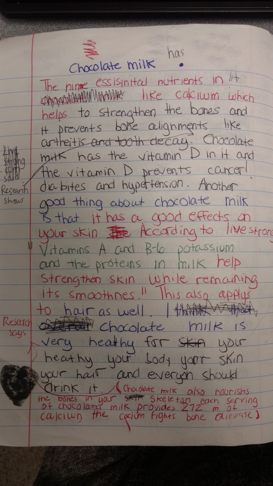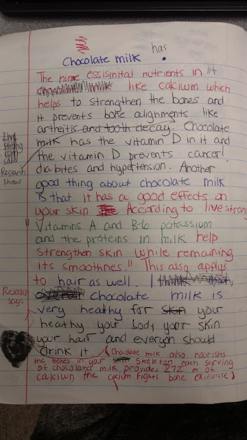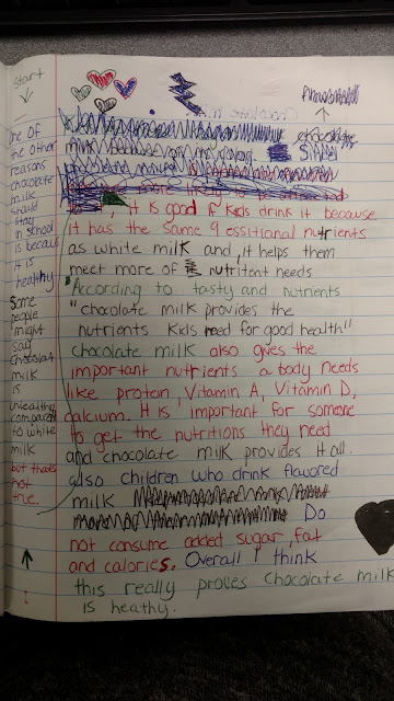 Although we are only approaching the second bend in this unit, we have seen some tremendous work from our kids. The next step to take in our writing is to consider counter-arguments that will help enhance our arguments. You can see that the student above has already done this by stating, "Some people might say that chocolate milk is unhealthy compared to white milk but..."