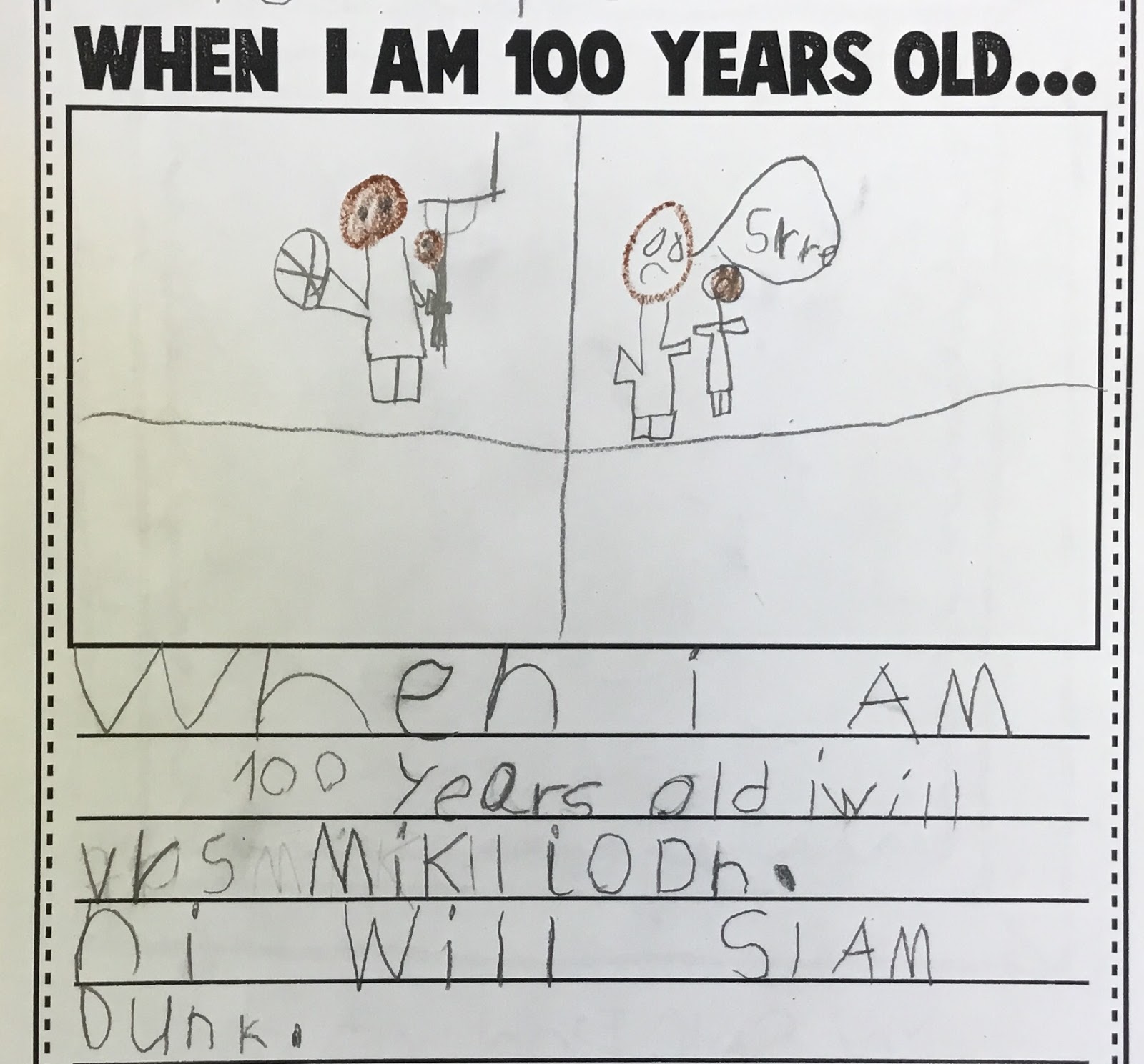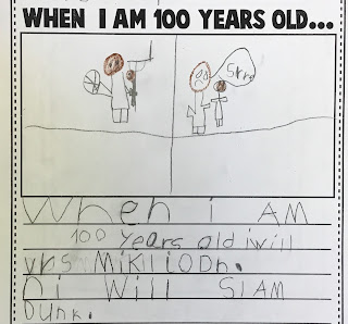 We also took the number 100 and applied it in our writing. We brainstormed some ideas about what we would do when we are 100 years old. It was funny to see the kids' sense of time. A lot of the kids said that they would be in college, or talked about their profession at 100 years old.