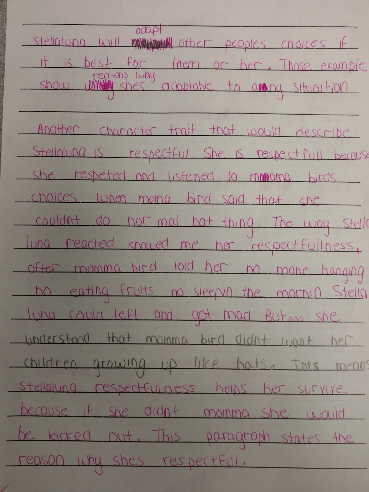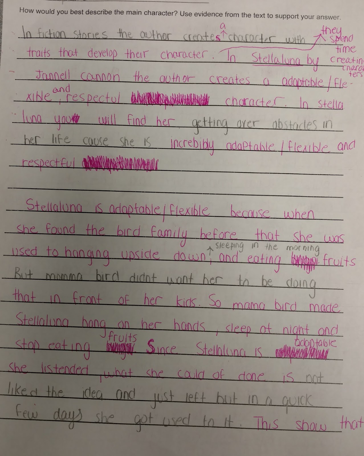 From this activity we took our thinking further to produce a written literary analysis of the character development in Stellaluna. The students are working on analyzing the text evidence to explain how it supports their claim. We are trying to push their thinking outside of their comfort zone to move from analysis like, "This shows that Stellaluna is friendly." to "This shows that Stellaluna would do anything to keep her friends safe." We want them to realize that their evidence has to relate back to their character traits and explain, in their own thinking, how the author used that situation to develop the character.