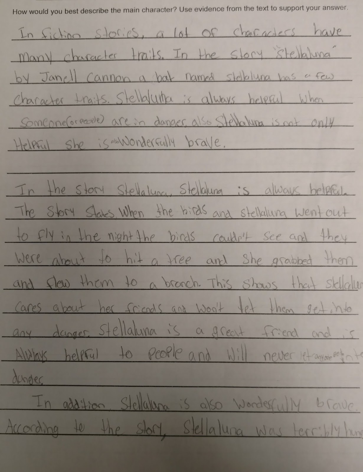 Character analysis is an incredibly important skill in language arts. It is also a skill that is developed little by little over time. It starts as small as describing how a character responds to challenges within the story, and moves to describing a character in depth using his/her thoughts, feelings, words and actions. The fifth graders have been working diligently on determining character traits in fiction stories. They not only discover the trait that best describes the main character, but also give evidence that supports their thinking. Here are some examples of student work showing character traits with text evidence of Stellaluna.
