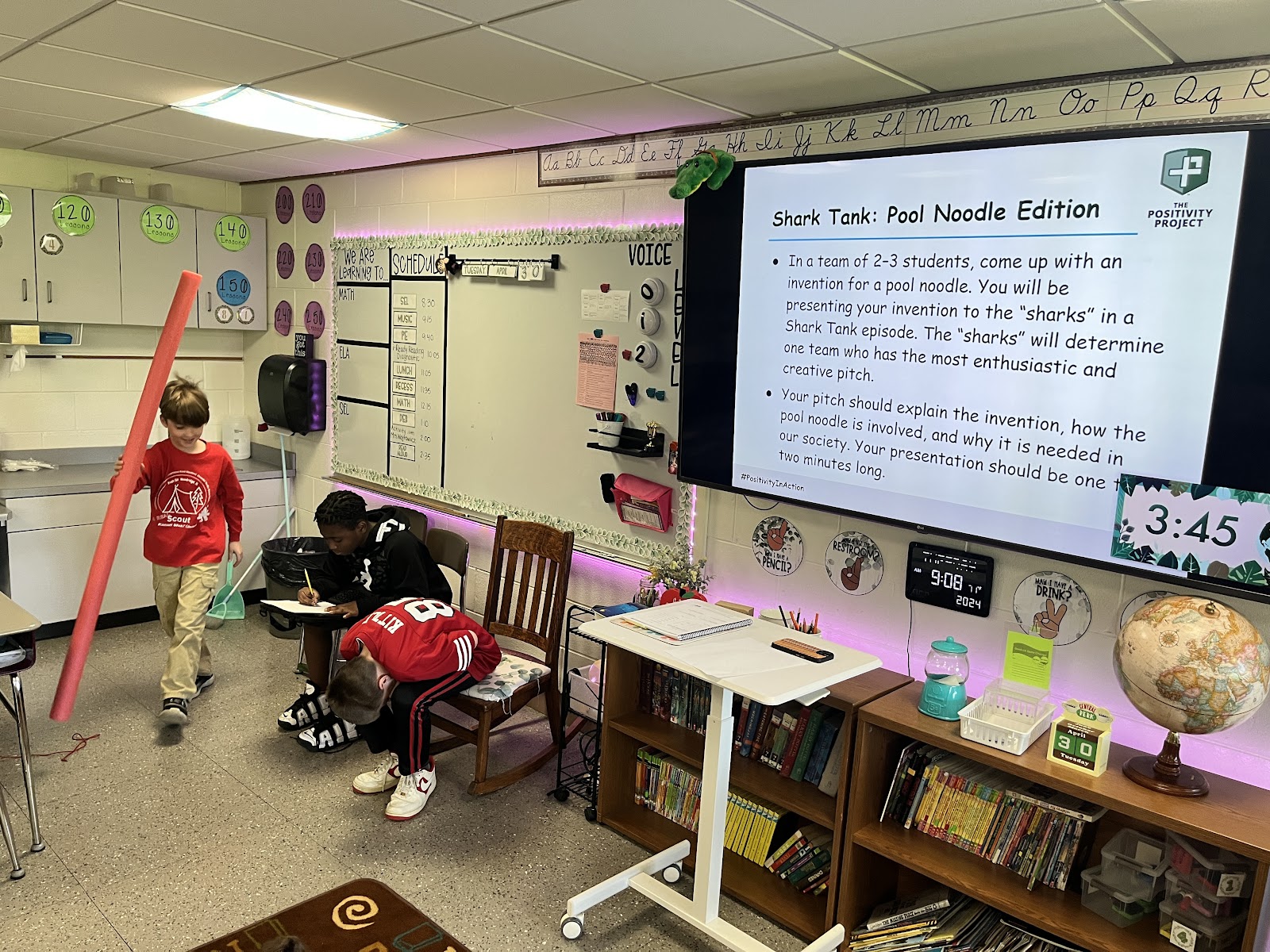 To practice enthusiasm, students took something as ordinary as a pool noodle and transformed it using their creativity. In groups of 3-4, fourth graders became entrepreneurs, tasked with inventing a new and innovative use for the pool noodle. In addition, groups had to craft a compelling "pitch" fit for the high-stakes arena of Shark Tank. Before groups began, students watched clips of children their age who successfully pitched an invention to the real sharks on Shark Tank.